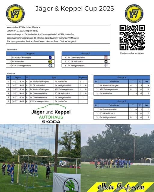 🔵🟡 + Jäger und Keppel Cup 2025 + 🟡🔵 Am zweiten Spieltag unseres Jäger und Keppel Cup 2025 @autohaus_jaeger_und_keppel gewann SV Altdorf- Böbingen @svab_1958 gegen den @asvschwegenheim_1929 auch ihr zweites Spiel (1:0) und steht somit schon im Halbfinale. Im späten Spiel gewann SV Gommersheim @svg1945 mit 2:0 gegen den 1. FC 08 Hassloch @fc08hassloch . ⚽️🥅🏆 Heute treffen im frühem Spiel der SV Gommersheim und der FV Heiligenstein @fvheiligenstein aufeinander. Und im späten Spiel ASV Schwegenheim gegen @fv_hanhofen_1946 . +++ Kommt vorbei, erlebt spannende Spiele und genießt gutes Essen wie Spieße, Bratwurst oder Wurstsalat und dazu kühle Getränke wie Bier von Fass, n leckere Schorle oder ne kühle Coke. Wir freuen uns auf Euch. #meindorfverein ##fvhanhofen #08hassloch #altdorfböbingen #schweschnemerjungs #heiligenstein #gommersheim #gruppenphase #jägerundkeppelcup